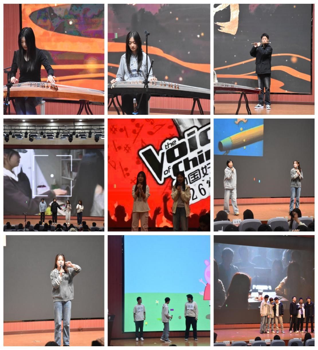 表彰环节结束后,获奖宿舍分别展示了各自的丰硕成果。民乐合奏《象王行》先声夺人,氛围瞬间点燃;五个宿舍依次登台展示了各具特色的舍徽设计历程,从理念构思到视觉成型,每一处细节都凝聚着同学们的巧思与团队智慧;手抄报作品《雅室生辉》,通过图文并茂的形式,生动诠释了宿舍文化的内涵,彰显出深厚的情感寄托与人文意趣;宿舍成员合唱《一笑倾城》、《爱错》、《成都》,以歌声传递出室友间的温情与默契;宿舍主题演讲《屋檐下的星光》《致635的我们》,真挚表达了同学们对宿舍生活的深厚情感与美好期盼;舞台剧《宿舍好声音》、英语表演《Muddy Puddles》及微电影《629“甄嬛传之旷课风波》,则凭借生动演绎与巧妙创意,将现场气氛推向高潮,笑声掌声不绝。