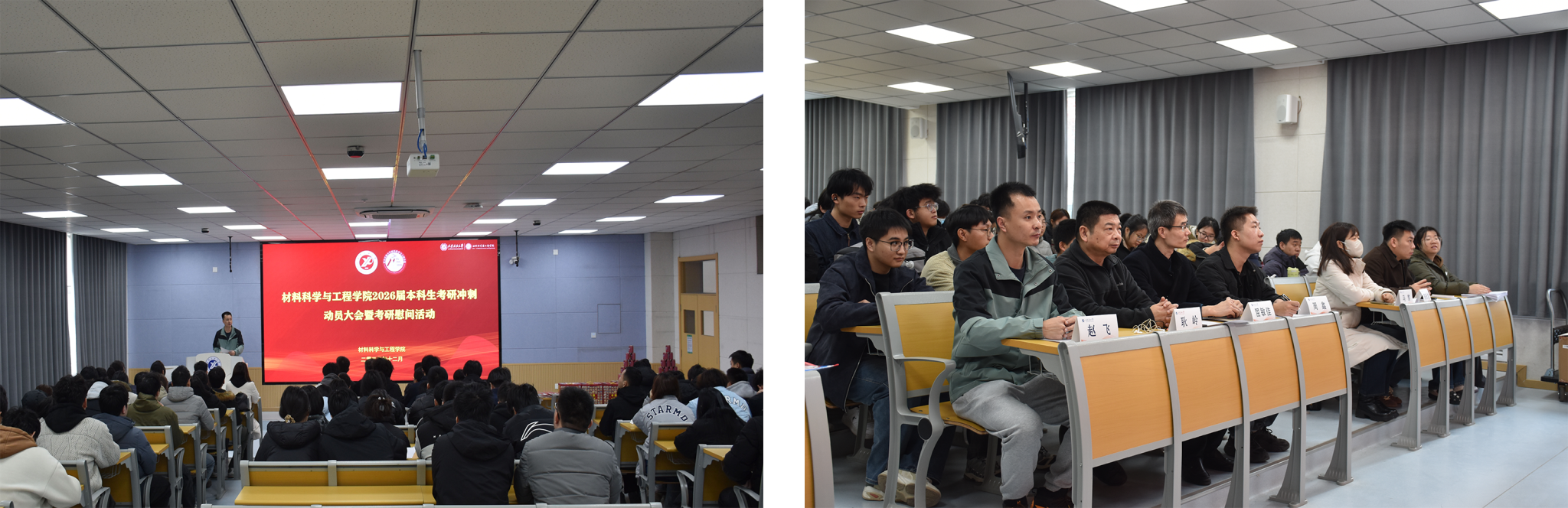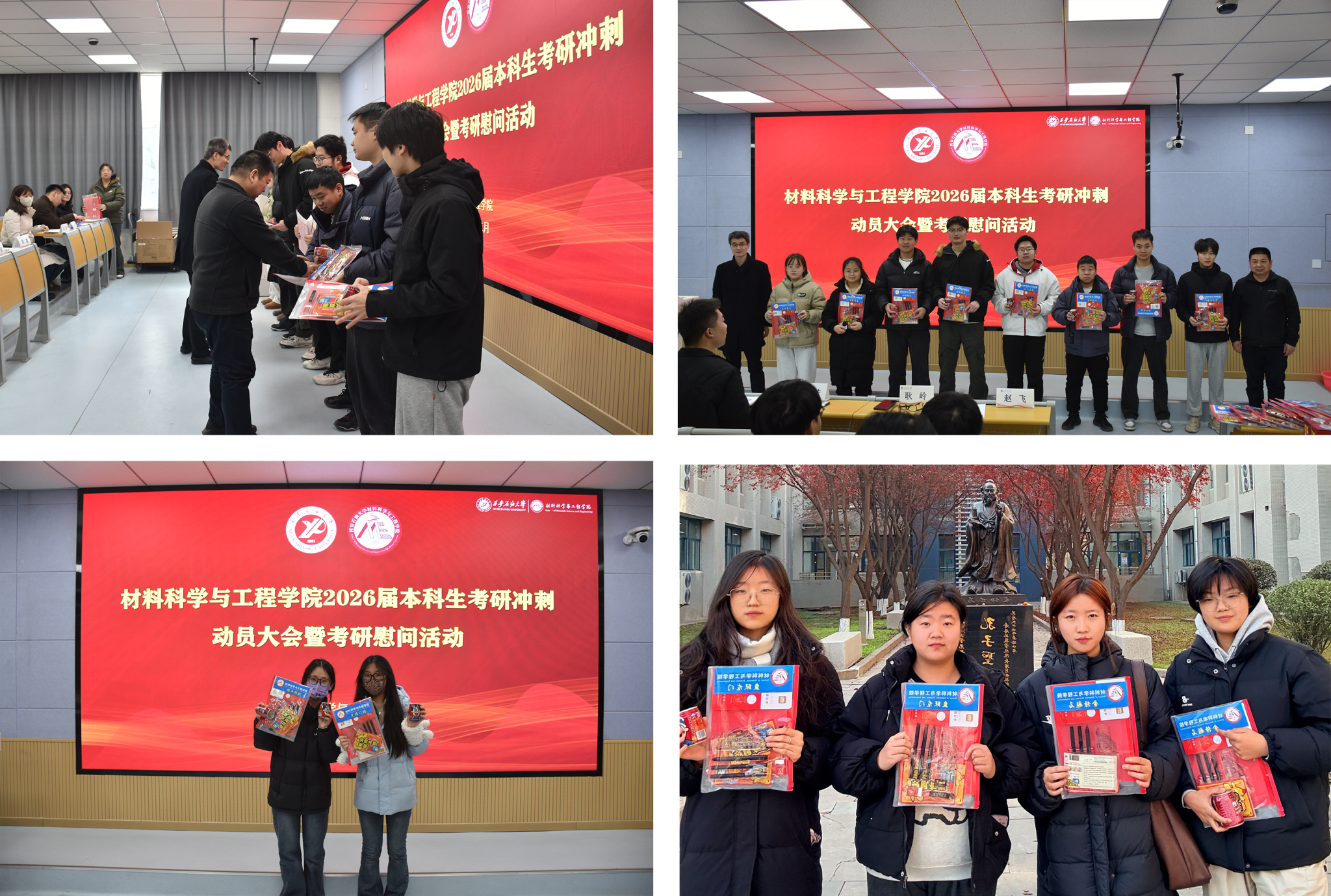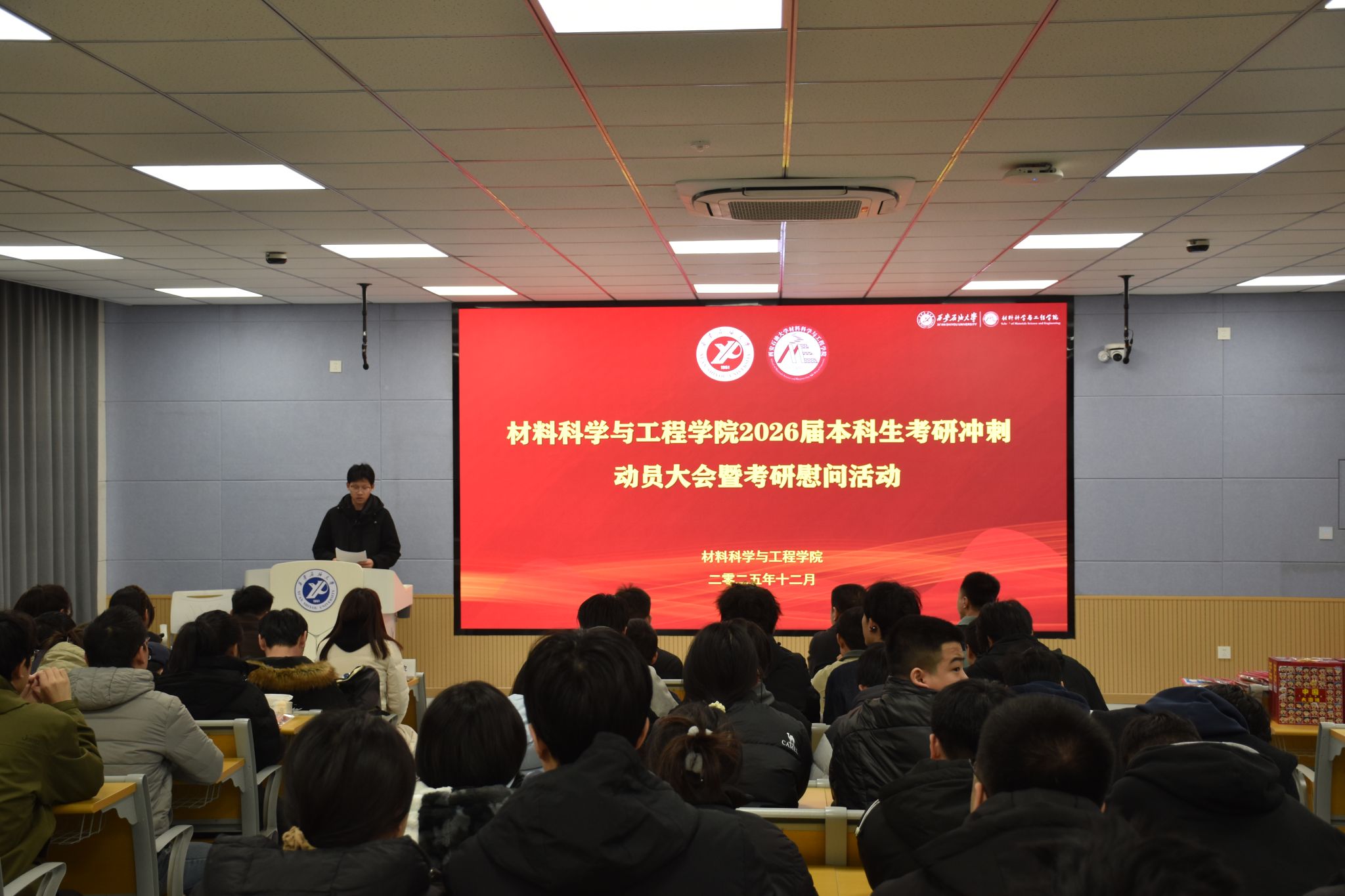 为深入贯彻“以生为本”育人理念,切实关怀考研学子备考状态,缓解备考压力,增强迎考信心,12月4日,AC米兰中文在鄠邑校区博览楼110教室举行2026届本科生考研冲刺动员大会暨考研慰问活动。学院党委书记耿岭,党委副书记屈敏佳,各年级辅导员和2026届考研学生100余人参加活动。活动由学院学生工作办公室副主任赵飞主持。