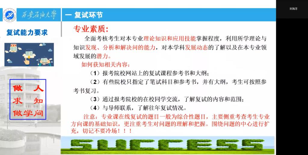 本次会议为我院2022届考研学子第二场复试专题指导咨询会,为同学们在复试环节提供了指导、明确了方向、增强了信心。学院将继续为考研学子精准施策、全程指导,全面助力考研学生成功上岸,争创学院考研新佳绩。