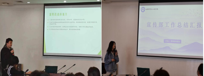 学院团委学生会各部门主要负责人依次进行述职汇报,以PPT形式就2023年度工作成果,组织建设、日常事务等情况进行汇报,深度剖析了工作中遇到的问题与挑战,对不足之处进行反思,同时提出了新一年的工作规划和畅想。他们表示将发挥好师生之间的桥梁纽带作用,切实解决身边同学的合理诉求,用实际行动为同学做好事、做实事,凝心聚力,齐同并进。