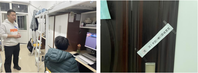 离校前,辅导员深入宿舍叮嘱同学们离校前关好水电门窗、清理宿舍卫生、妥善保管私人物品,并在宿舍粘贴封条。