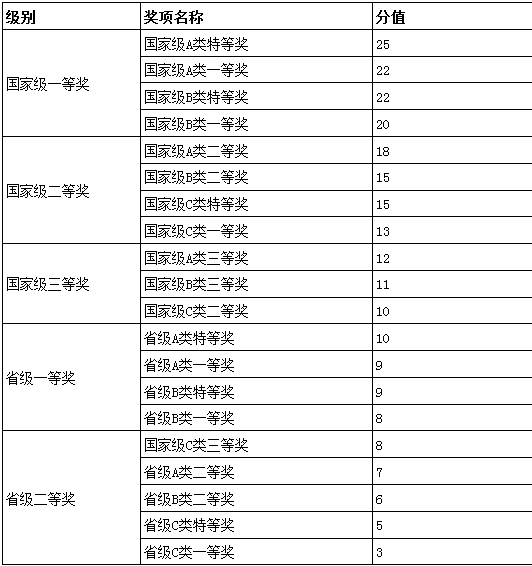 学生本科阶段参加与学业相关的国内权威科研竞赛并获得省部级二等奖及以上奖励(国际赛事参照执行,但不得低于国内赛事相关要求),各级学科竞赛获奖按下表进行加分: